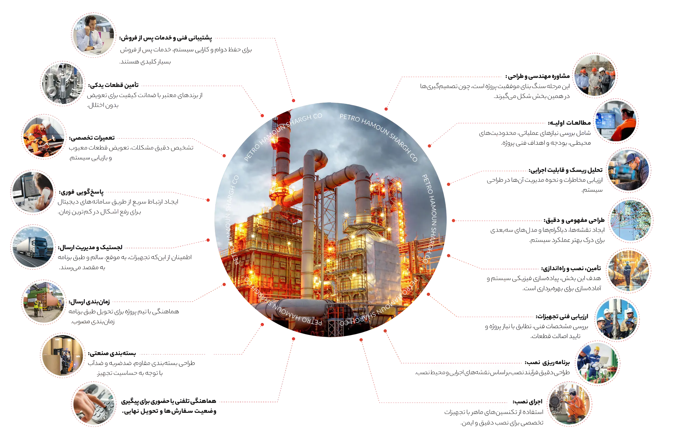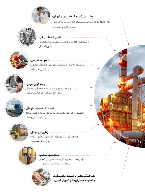 پتروهامون شرق با شبکهای جهانی و تیمی متخصص، زنجیرهای مطمئن برای تأمین تجهیزات و مواد اولیه صنایع نفت، گاز و پتروشیمی فراهم میآورد تا همراه مطمئن پروژههای صنعتی شما باشد.